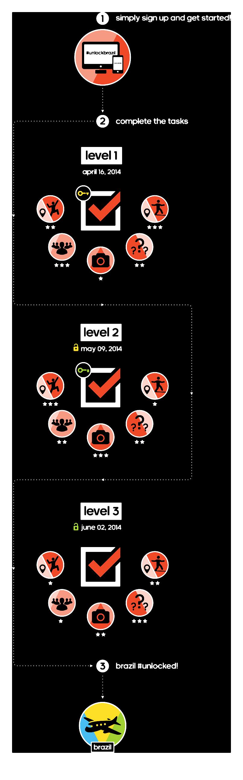 Brzmi świetnie? Dowiedz się zatem na czym polega wyzwanie. „#unlockbrazil” to zabawa łącząca zadania online ze sprawnościami w świecie rzeczywistym. Za aktywność przyznawane są punkty. Aby „odblokować” brazylijskie tereny outdoorowe użytkownicy będą musieli wykonać zadania: