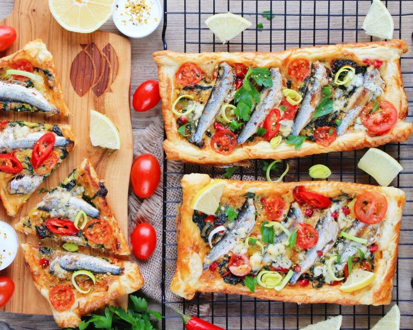 sos ziołowy lub sos czosnkowyRyby czyścimy – patroszymy, odcinamy głowę i wyjmujemy kręgosłup. Płuczemy pod zimną wodą i osuszamy papierowym ręcznikiem. Ciasto francuskie dzielimy na 3 – 4 równe części. Boki ciasta zagniatamy do środka, tworząc wyższy rant, dociskamy lekko widelcem (patrz zdjęcie). Układamy na blasze wyłożonej papierem do pieczenia. Na patelni rozgrzewamy masło klarowane i przekładam białą część pora posiekaną w talarki. Chwilę podsmażamy, następnie dodajemy posiekaną papryczkę chili i świeży szpinak. Doprawiamy do smaku solą, pieprzem, sokiem z cytryny. Odparowujemy nadmiar wody. Kolejno dodajemy mascarpone i mieszając podgrzewamy, aż serek rozpuści się i połączy z warzywami. Farsz wykładamy cienką warstwą na ciasto francuskie. Na farsz wykładamy szprotki i pomidorki koktajlowe pokrojone na plasterki. Jajka roztrzepujemy ze śmietaną i tą mieszanką polewamy w środku nasze tarty, na wierzch dodajemy pokruszony ser pleśniowy. Boki ciasta smarujemy rozbełtanym jajkiem. Całość wstawiamy do piekarnika rozgrzanego do 180 stopni C i pieczemy przez 20 – 25 minut. U mnie funkcja góra – dół. Tarty muszą apetycznie przyrumienić się. Po upieczeniu przekładamy je na kratkę ruszt. Serwujemy z ulubionymi sosami, udekorowane cząstkami cytryny oraz natką pietruszki.