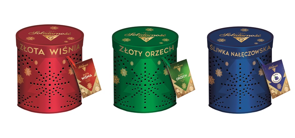 Praliny Złota Wiśnia, Złoty Orzech i Śliwka Nałęczowska Solidarności są dostępne w edycji limitowanej w unikalnych puszkach-lampionach z delikatnym, ażurowym motywem. Tworzą spójną kolekcję trzech wzorów, opatrzonych bilecikiem z miejscem na personalizowaną dedykację. Puszki mogą stać się pięknym elementem dekoracji wnętrza. Wypełnione światełkami led lub świeczką zyskają drugie życie, jako świąteczny lampion. Solidarność: Złota Wiśnia, Złoty Orzech 187 g, Śliwka Nałęczowska, 190 g, cena det. ok. 20 zł/szt.