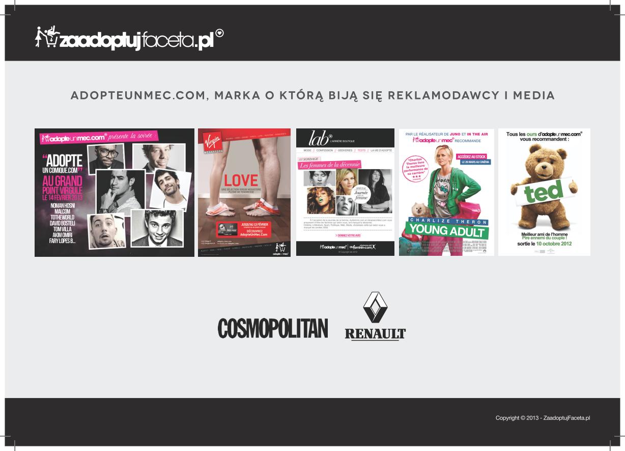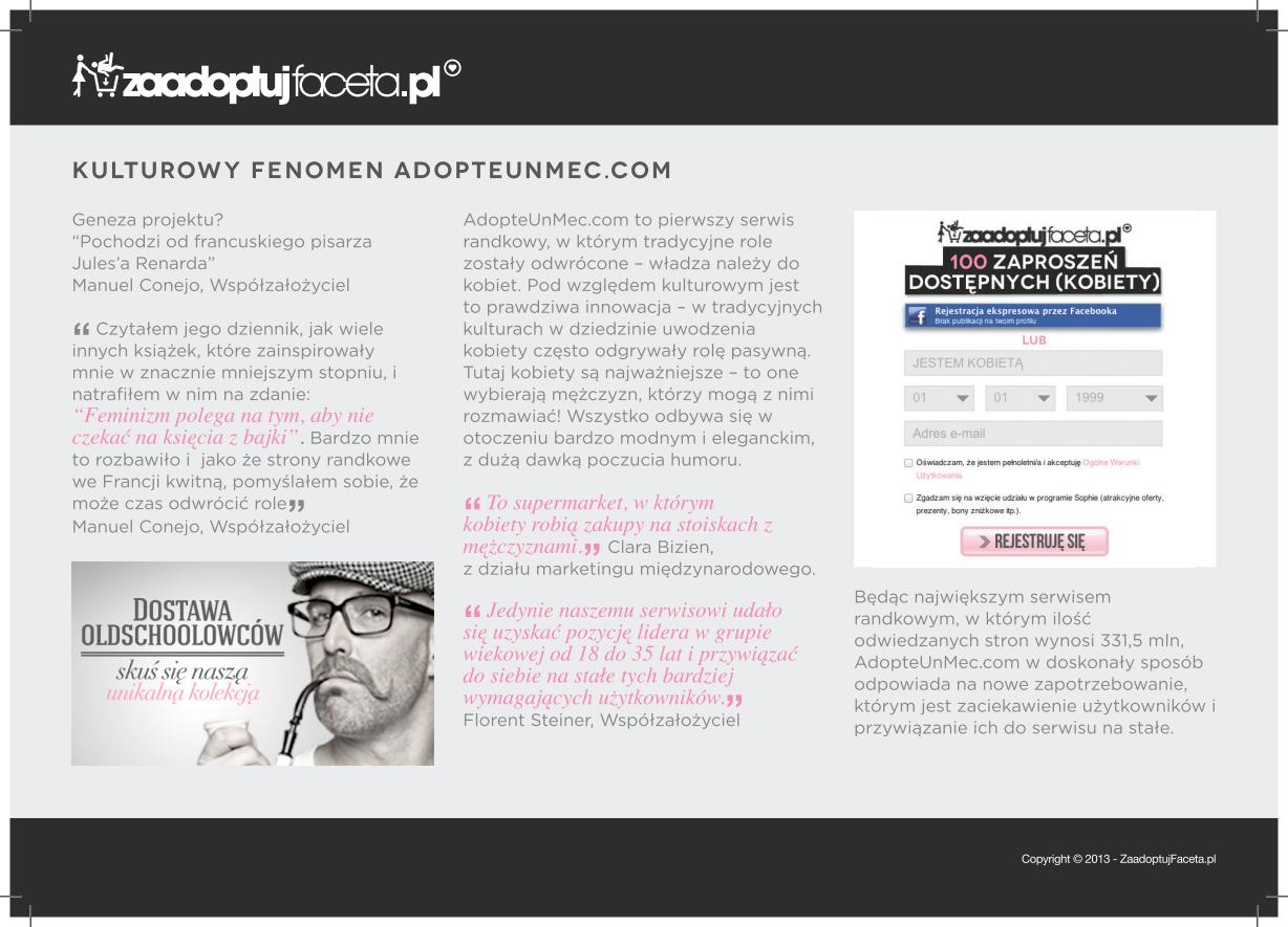 ZaadoptujFaceta.pl to niebanalny serwis społecznościowy, w którym władza należy do kobiet. Serwis zrywa ze stereotypem potulnej kobiety czekającej na księcia z bajki i odwraca role w relacjach damsko-męskich. W 2014 roku kobieta, która wykonuje pierwszy krok, nie powinna być uważana za „łatwą”. Portal odpowiada na oczekiwania generacji „wyrośniętych nastolatków”, którzy dotąd uważali serwisy randkowe za przestarzałe lub „dla prawdziwych desperatów”.