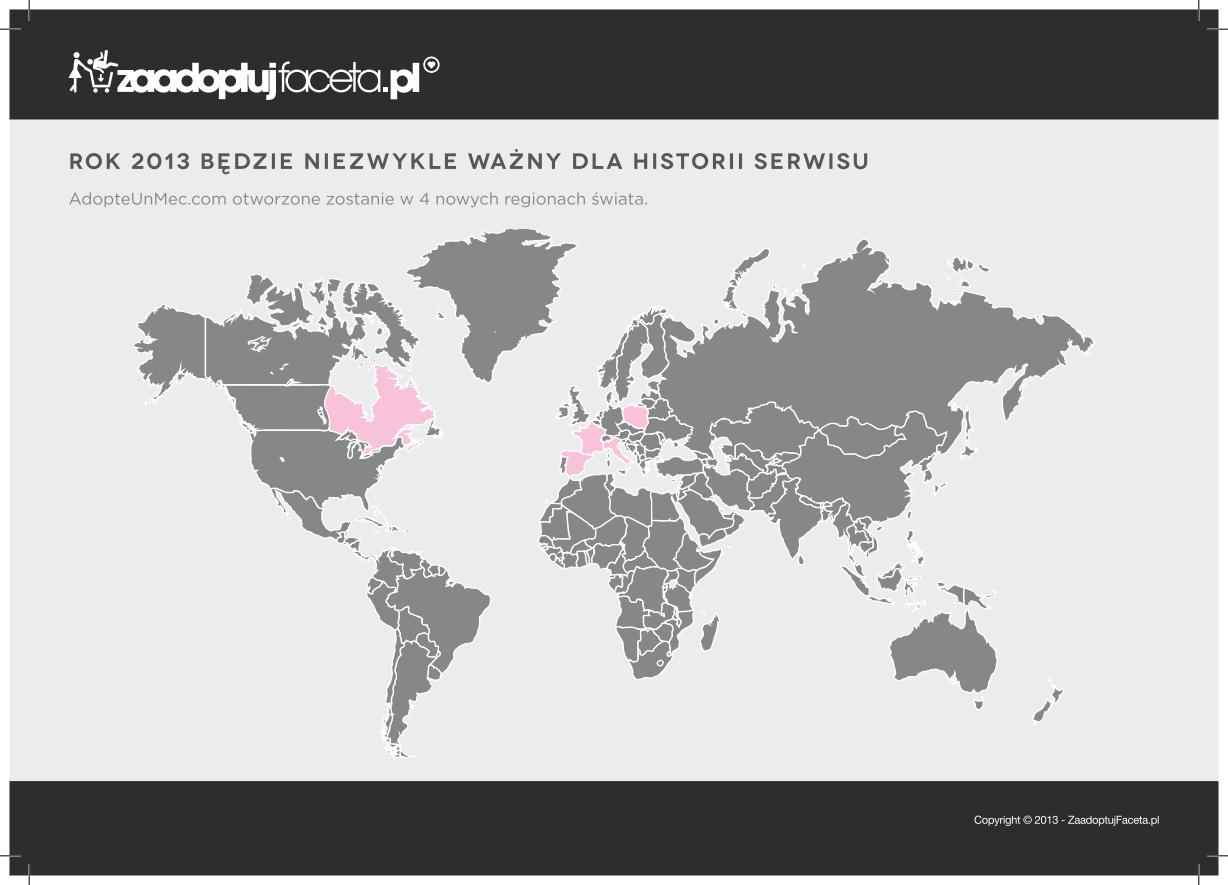 Transformację roli kobiet dostrzegł m.in. serwis ZaadoptujFaceta.pl, który zdobywa coraz większą popularność wśród młodych Polek i Polaków. Na ZaadoptujFaceta.pl to kobiety wybierają mężczyzn, z którymi chcą rozmawiać. I ta formuła ewidentnie działa, skoro wśród zarejestrowanych użytkowników jest 51 proc. kobiet i 49 proc. mężczyzn. Pod względem kulturowym jest to prawdziwa innowacja – w tradycyjnych kulturach kobietom nie wypadało uwodzić mężczyzn. Francuzi wręcz oszaleli na punkcie jego pierwowzoru – AdopteUnMec.com. Nie mieć tam konta to jak w Polsce nie być na Facebooku. Średni czas spędzany w serwisie to już 15 minut, co jest świetnym wynikiem (na Facebooku to odpowiednio 28 minut).Normą we Francji jest dzielenie się informacjami o nawiązanych znajomościach czy otrzymanych wiadomościach na AdopteUnMec.com.